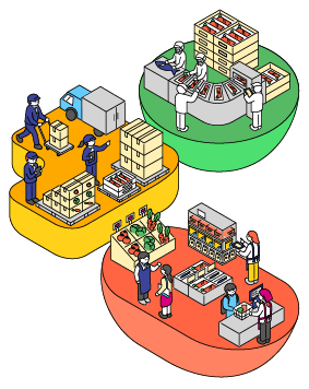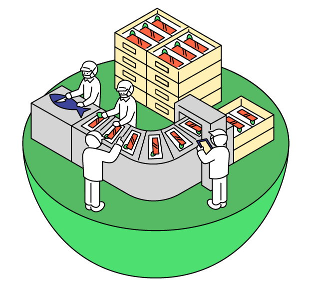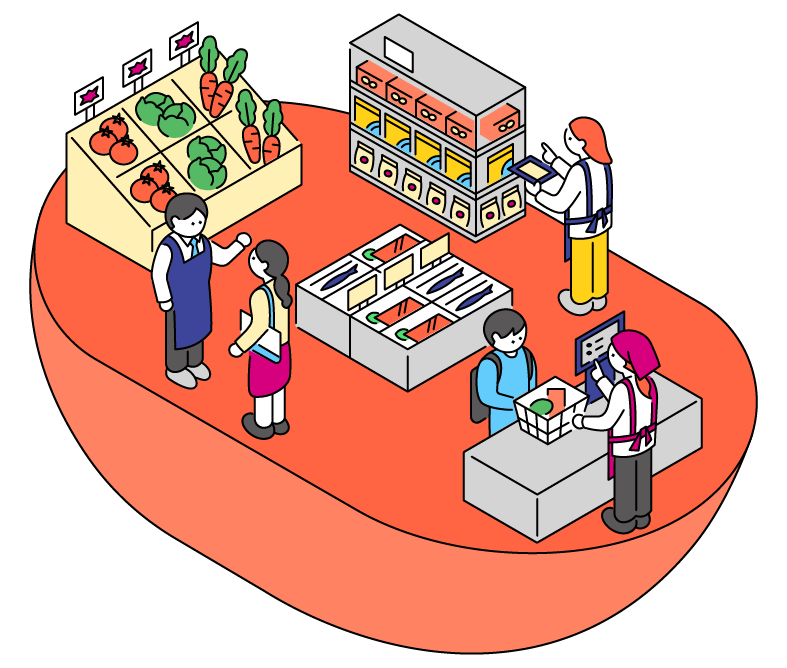 スーパーの仕事は、接客だけではありません。毎日の食を支えるために、仕入れ・加工・品出し・売場づくり・物流など、さまざまな役割が連動して成り立っています。現場では、売上などの数字に基づく改善やチーム運営を通じて、日々の生活を支える仕組みをつくります。